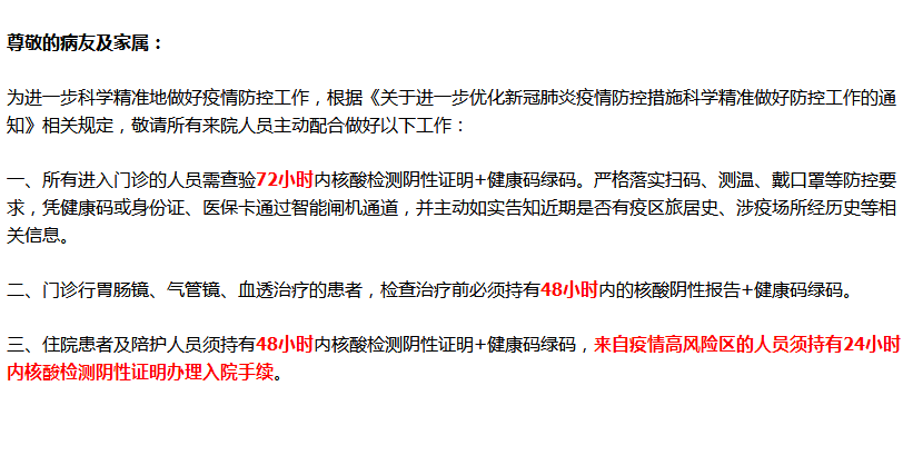 为进一步科学精准地做好疫情防控工作,根据《关于进一步优化新冠肺炎疫情防控措施科学精准做好防控工作的通知》相关规定,敬请所有来院人员主动配合做好以下工作: