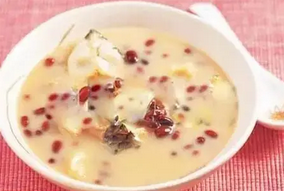 原料:薏苡仁30克,赤小豆30克,陈皮5克,生姜3片,鲫鱼1条(约400克)。鲫鱼去鳞及肠肚,洗净,入油锅煎熟备用。慧苡仁、赤小豆、陈皮、生姜洗净,与鲫鱼一同放入砂锅,加适量清水,大火煮沸,小火熬煮1~1.5小时,加入适量料酒,煮沸片刻后即可。