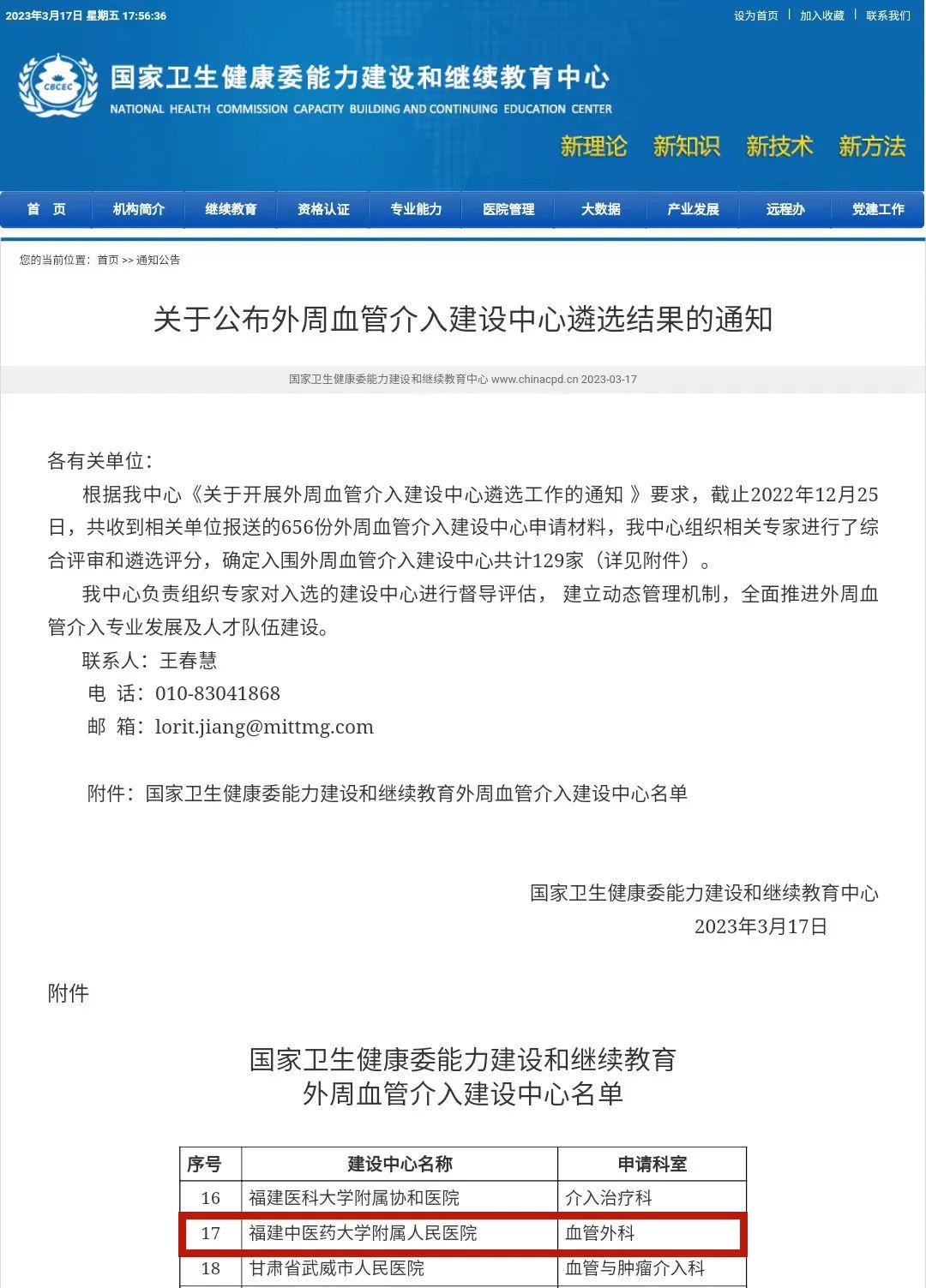 近日,国家卫生健康委能力建设和继续教育中心公布了入围外周血管介入建设中心名单,