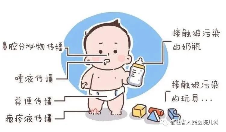3、接触传播:间接接触宝宝的粪便或被疱疹液污染玩具等物品,宝宝的口腔分泌物、鼻咽分泌物短期内也可以携带病毒。疱疹一旦破溃,里面的病毒含量是非常高的,传染性也很强。