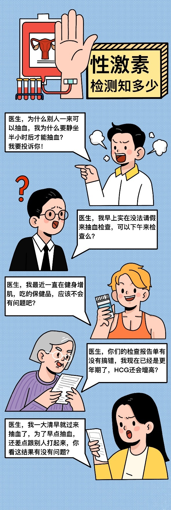 激素的分泌受个体状态因素影响很大。恐惧、紧张、激动、兴奋、呼吸急促等可导致激素分泌量增加。运动后能量消耗及暴热后大量出汗会导致体液大量丢失,性激素水平相对升高;睡眠、寒冷状态时激素分泌低,导致检测水平偏低。因此,激素检测要求静坐30分钟,排除个体情绪因素影响后方可抽血。