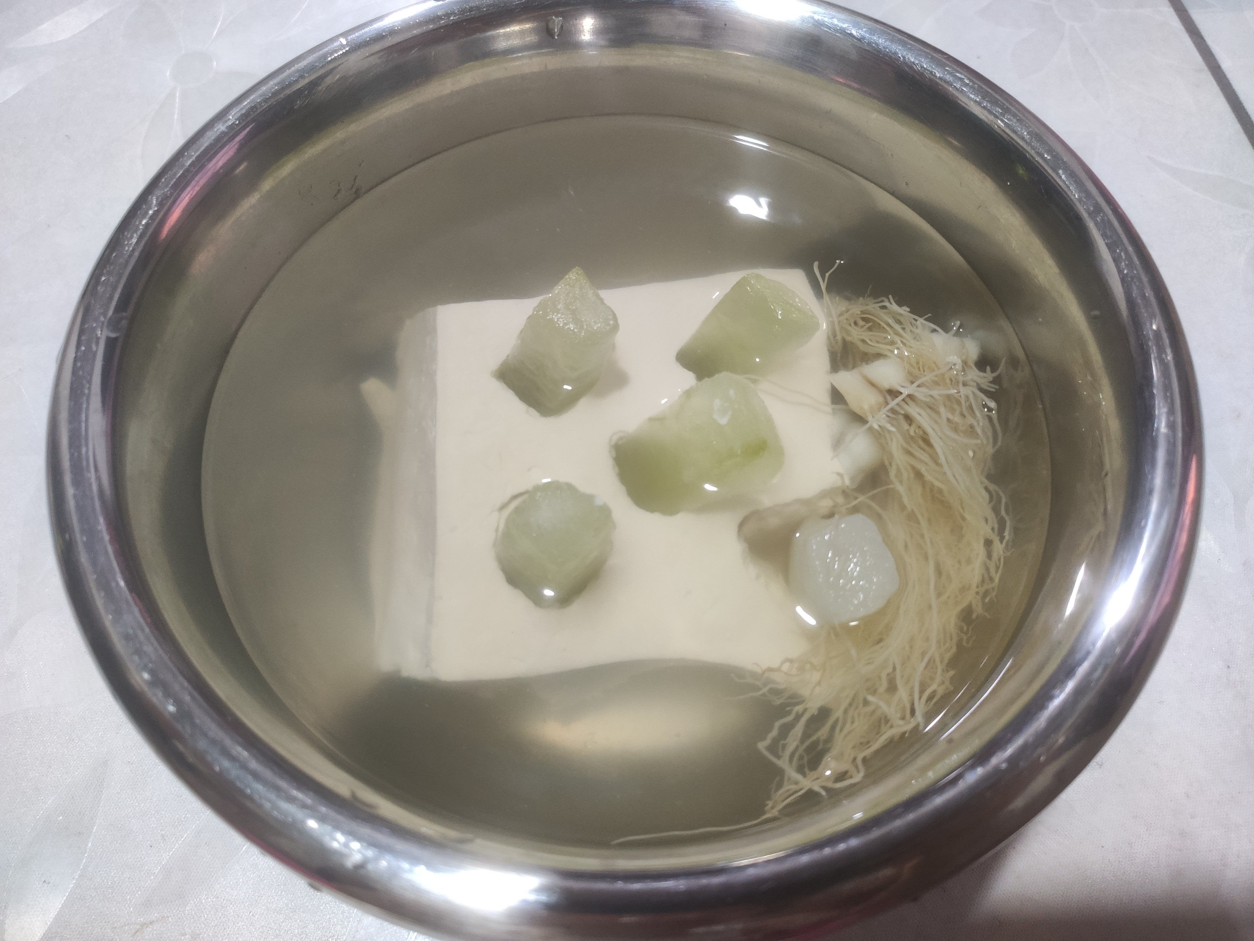 【制作方法】冬瓜糖均匀插在豆腐上,置锅中,加洗净的葱根和清水适量,大锅煮开后转小火再煮