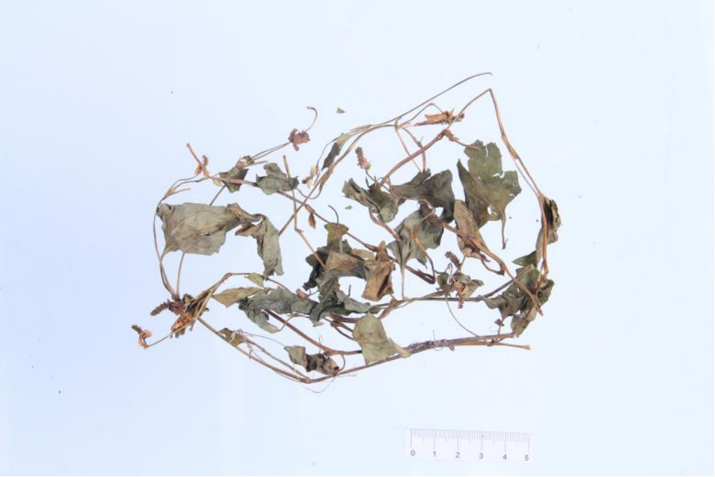 干鱼腥草 茎呈扁圆柱形,扭曲,表面黄棕色,具纵棱数条;质脆,易折断。叶片卷折皱缩,展平后呈心形,上表面暗黄绿色至暗棕色,下表面灰绿色或灰棕色。穗状花序黄棕色。