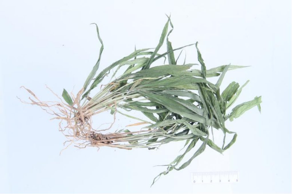 【性状】本品长25~75cm。茎呈圆柱形,有节,表面淡黄绿色,断面中空。叶鞘开裂。叶片披针形,有的皱缩卷曲,长5~20cm,宽1~3.5cm;表面浅绿色或黄绿色。叶脉平行,具横行小脉,形成长方形的网格状,下表面尤为明显。体轻,质柔韧。气微,味淡。
