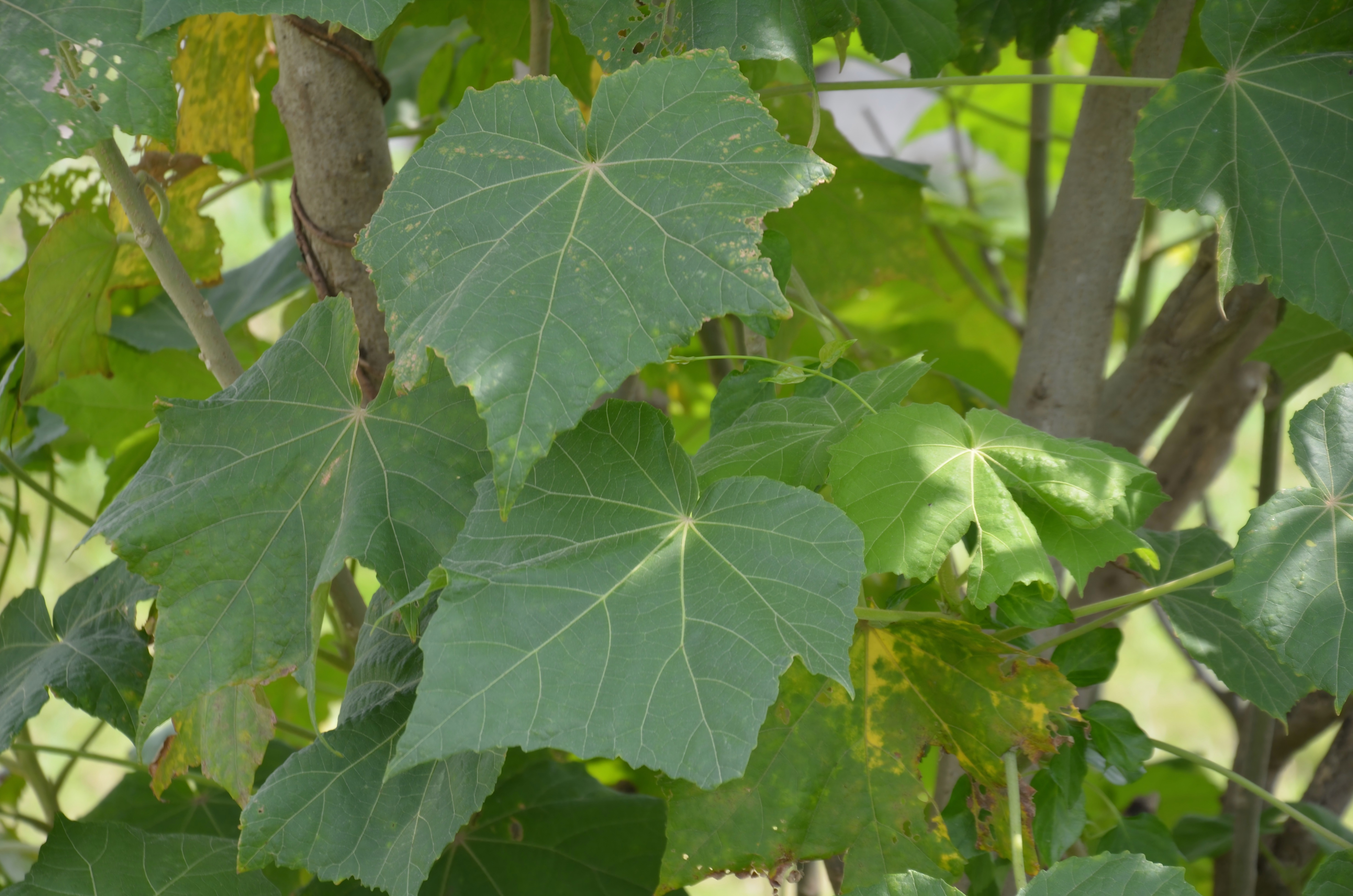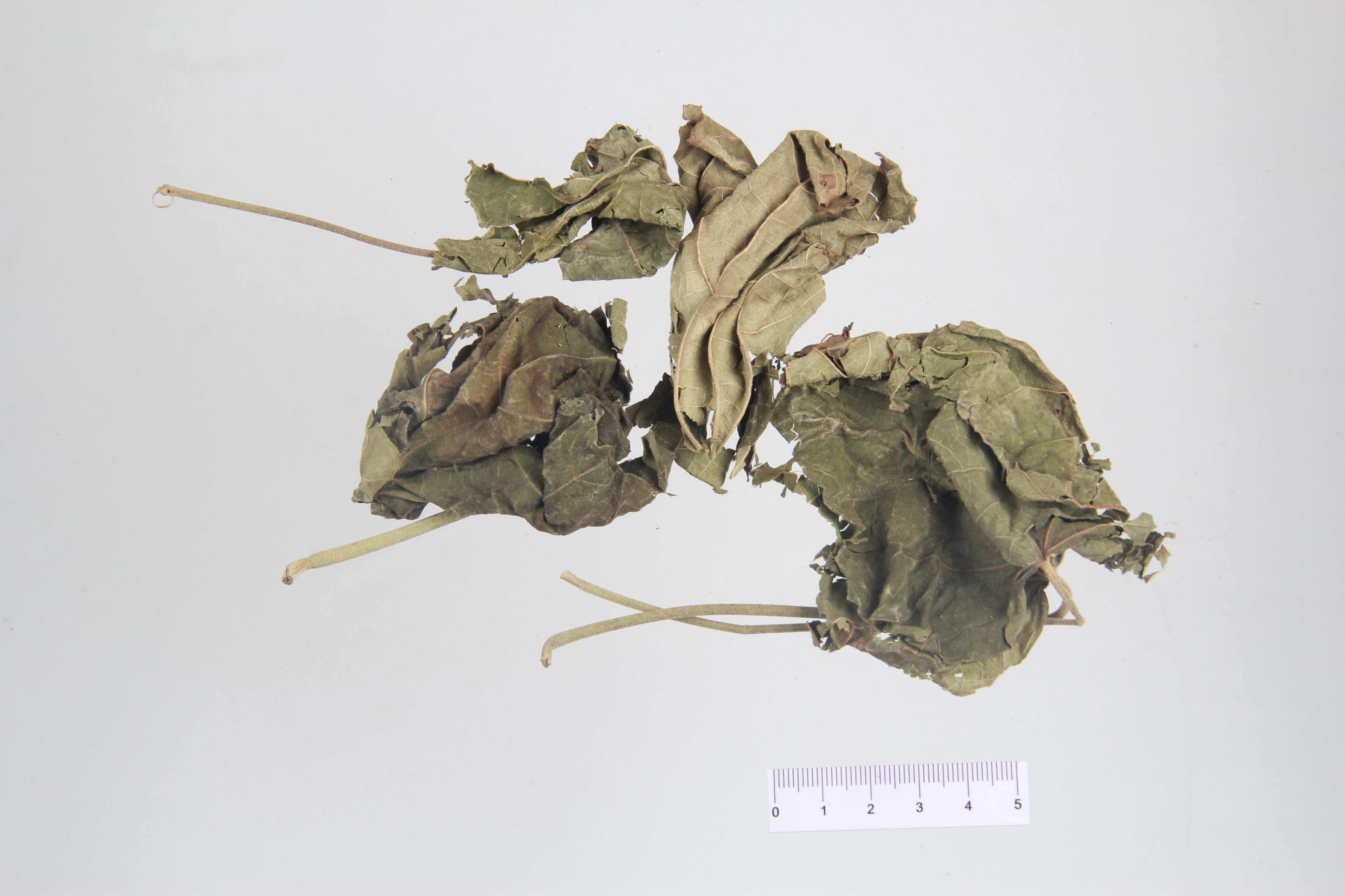 【性状】本品多卷缩、破碎,全体被毛。完整叶片展平后呈卵圆状心形,宽10~20cm,掌状3~7浅裂,裂片三角形,边缘有钝齿。上表面暗黄绿色,下表面灰绿色,叶脉7~11条,于两面突起。叶柄长5~20cm。气微,味微辛。