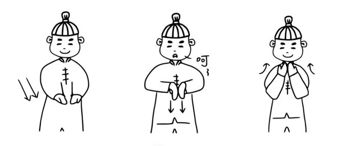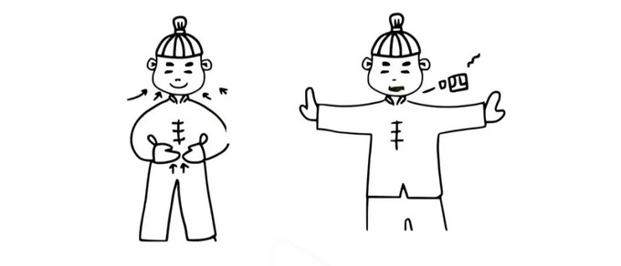 作用:练习此式可略带笑意,松解膻中穴郁结。尤其适用于三焦不畅而引起的喉痛、咽肿、胸腹胀闷、便秘、小便不利等病证。